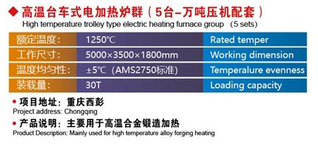 產(chǎn)品名稱:高溫臺(tái)車式電加熱爐群(5臺(tái)-萬噸壓機(jī)配套) 產(chǎn)品描述: ![]()